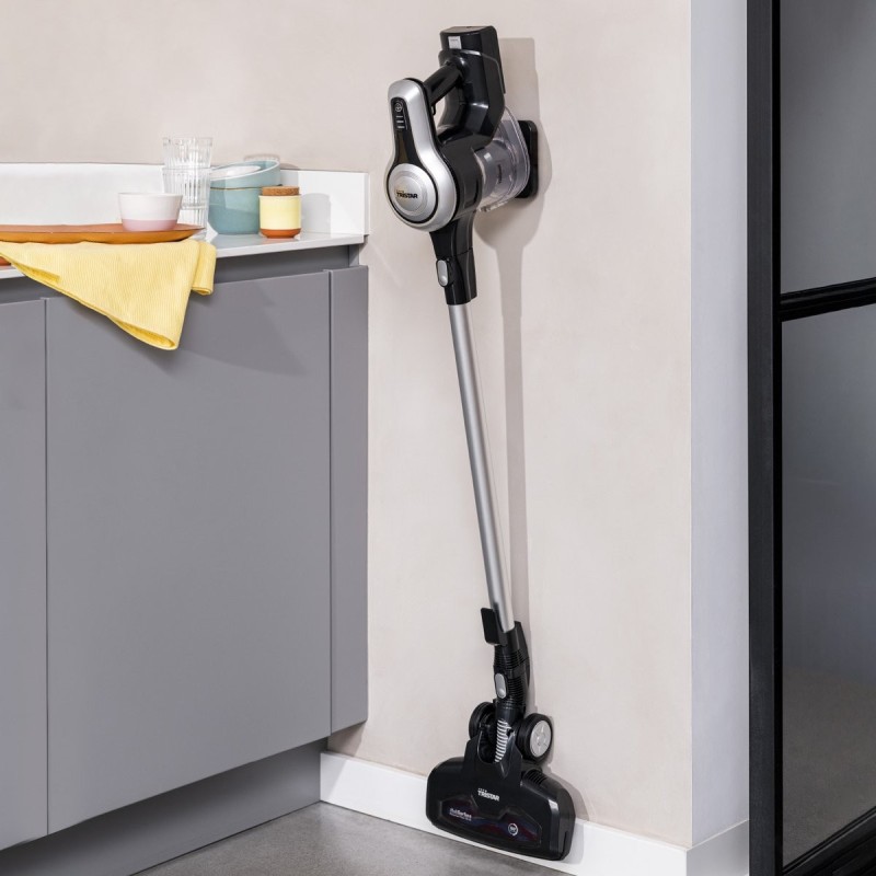 L'aspirateur manuel Tristar possède un moteur puissant 22,2 V DC qui lui donne plus de force d'aspiration. Le filtre en métal de cet aspirateur sans fil assure un meilleur flux d'air jusqu'à 10 kPa. De plus, la technologie cyclonique avancée garantit un résultat durable et efficace grâce à la séparation de l'air et de la poussière. Il présente 2 réglages de vitesse, ce qui est très pratique lorsque de grosses miettes tombent sur le tapis. Ces vitesses sont faciles à régler sur la poignée de l'aspirateur. À sa vitesse la plus élevée, vous pouvez utiliser l'aspirateur pendant 24 minutes d'affilée. À sa vitesse la plus faible, vous pouvez vous en servir jusqu'à 40 minutes ! Ainsi, vous pouvez nettoyer le plafond et le sol en même temps.