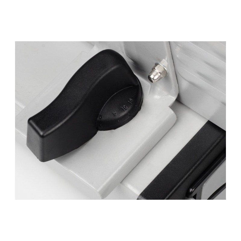 Trancheuse électrique, robuste pour la viande, le fromage le pain, ..etc Revetement en acier inoxydable laminé à froid , Lames 19cm, , Epaisseur de coupe réglable de 0 à 15mm, pieds anti-dérapants