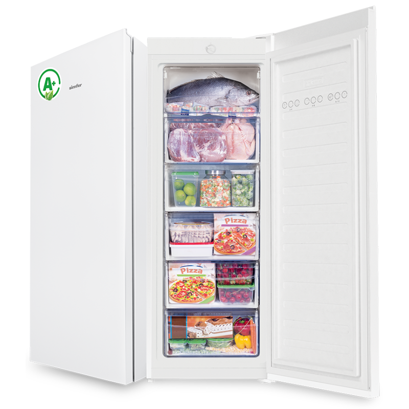 Congélateur Vertical, 6 tiroirs, Dégivrage Automatique , lessFrost , Fonction de congélation rapide, Capacité 210 L, Thermostat , Avertissement de porte ouverte , Avertissement de température élevée , Blanc