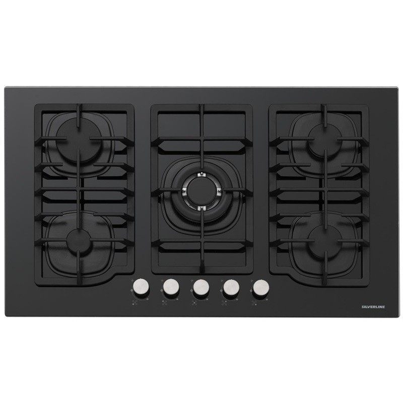 Plaque de cuisson encastrable à gaz, 5 Feux (1 brûleur WOK), Allumage électrique, Grilles et brûleurs en fonte, Sécurité thermocouple, 90cm, Verre noir