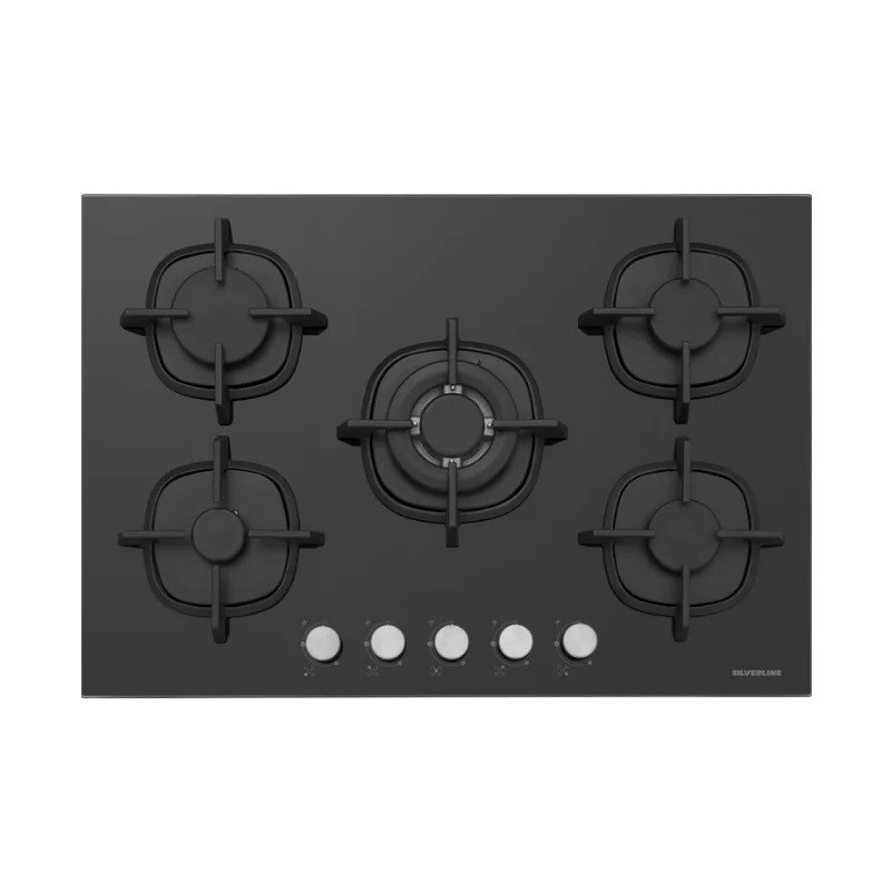 Table de cuisson encastrable à gaz, 5 Feux (dont 1 Wok) , Grille en fonte, Allumage automatique, Contrôle frontale, Sécurité Thermocouple, 75cm, Verre noir