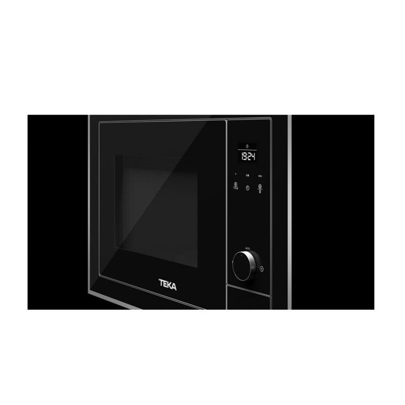 Micro-ondes encastrable, Capacité 20L, Ecran lED, Intérieur de porte plein verre, Minuterie, Signal sonore de fin de cuisson, Sécurité enfants, Auto menu B, Décongelation par poids et temps, 1 plateau en verre, 1 grille, 8 programmes, Puissance micro-ondes 1250W, Puissance du grill 800W, Noir