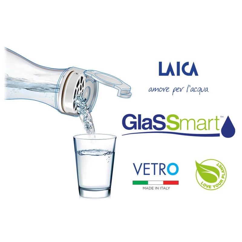 The Glassmart™ filter bottle, thanks to the FAST DISK™ activated carbon technology, filters the water instantly, preserving the minerals useful to the body present in the mains water and reducing chlorine. GlaSSmart™ by LAICA is a 100% Made in Italy glass filter bottle.