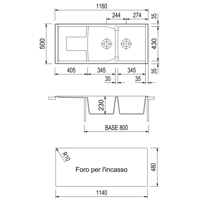 1160×500 mm - Évier à deux cuves plus égouttoir, réversible, avec trous pré-percés pour l'installation de robinets et accessoires one.