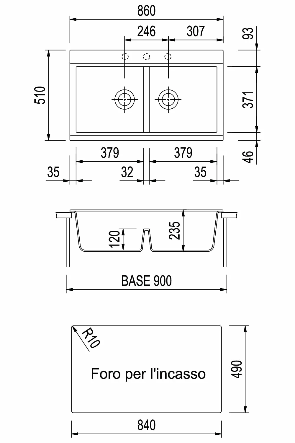 860×510 mm - Évier à deux cuves avec trous pré-percés pour l'installation de robinets et accessoires one