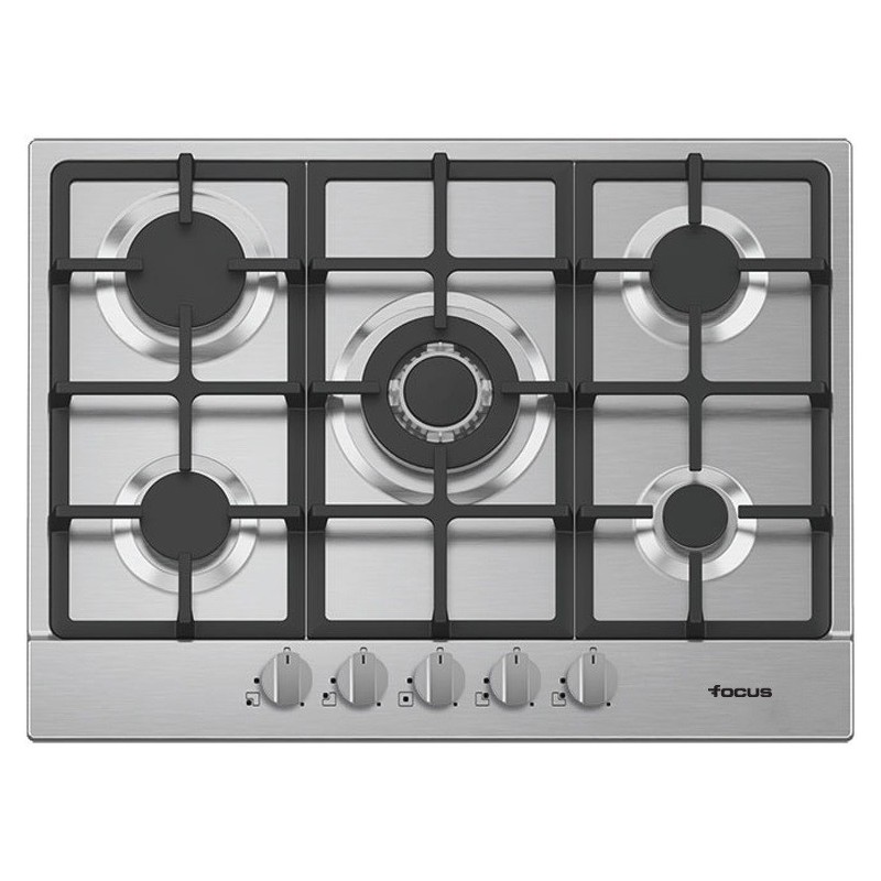 Table de cuissson à gaz, 5 feux, Grilles&Chapeaux Fonte , allumages automatique, Sécurité Thermocouple, Commandes fronatales, 70cm, Inox