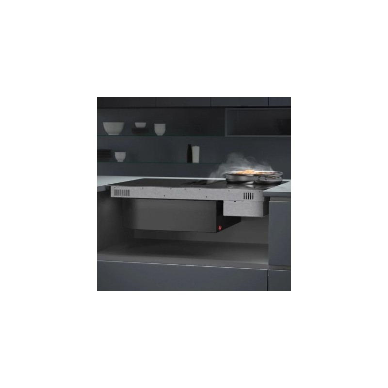 Données Techniques Hotte: Hotte de plan de travail Finition : Inox et Verre Trempé Version à conduit interne (évacuation / recyclage) Débit max : 610 m³/h Niveau sonore : 39 / 69 dB (A) Absorption totale : 200W Filtre à graisse noir en forme de U Contrôle : Tactile |