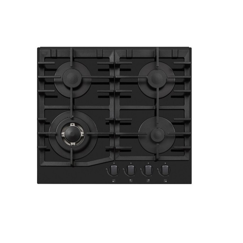 Table de cuisson, encastrable, 4 Feux dont 1 WOK, Allumage intégré, Grilles en fonte, Chapeaux bruleurs en fonte, dont 1 Wok, Sécurité Thermocouple, 60cm, Bruleurs SABAF ITALY 5 ans de garantie, verre noir