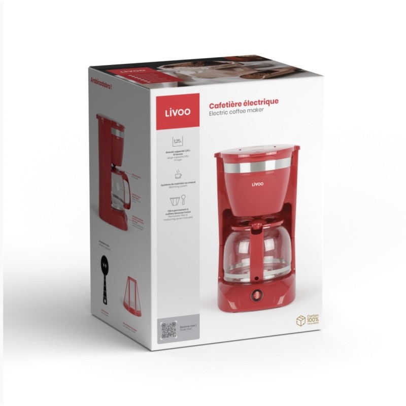 Cafetière électrique, Filtre permanent, 10-12 tasses, Réservoir 1.25L, Systèmes anti-gouttes, Systéme d'arrêt automatique, Fonction maintien au chaud, Bouton Marche/ Arrêt avec voyant lumineux, 800w, Rouge