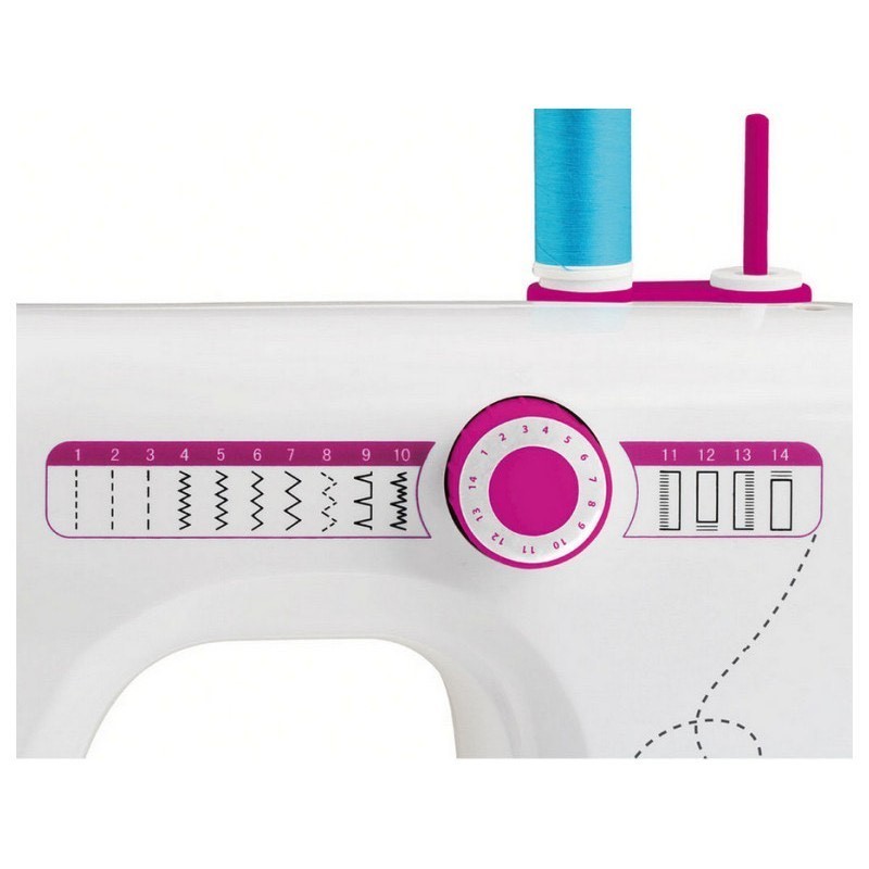 Machine à coudre, 14 ponts intégrés, Fonction couture avant et arriére, Double aiguille, Coupe fil, Enfilage assisté de l'aiguille, Systéme de rembobinage, Régulateur de tension du fil, Epaisseur du tissus de 0.3mm à 1.8mm, Accessoires inclus: (Pédale, adaptateur secteur, 4 canettes, 3 aiguilles, 1 double aiguille, découseur, enfileur, 3 pieds pour boutonniére, bouton et fermeture éclair ) , Eclairage LED, Bras libre, 9W