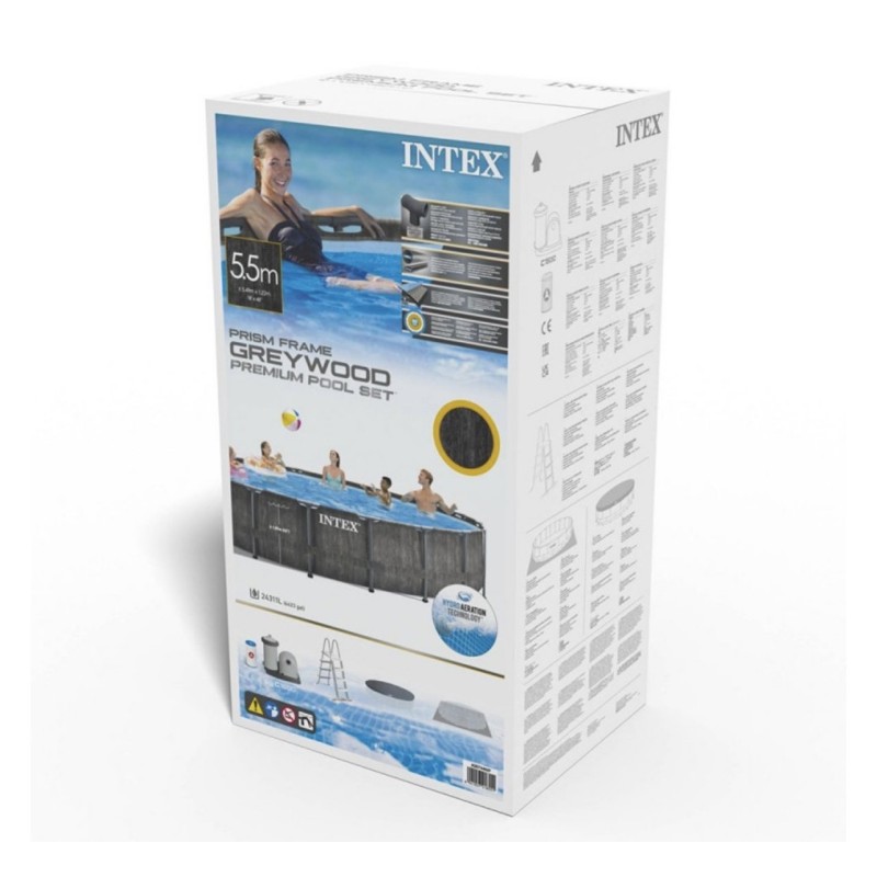 Piscine tubulaire Ronde, (ø)5,49 x (h)1,22 m, Dimensions au sol(ø) 5.49m, Dimensions surface de nage(l)5,49 x (l)5,49 m, Hauteur d'eau 1,07m, Temps de montage 60min, Capacité 24,3 m³, Débit filtration 4.4 m³/h, Cartouche A, Echelle de sécurité, Echelle avec plateforme, Bache et tapis de sol, Epaisseur vinyle 64/100mm, Gris cérusé