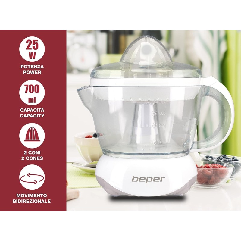 PRATIQUE : Le presse-agrumes électrique Beper est capable de vous faire apprécier les jus fraîchement pressés. Un pichet gradué de 700 ml avec poignée est conçu pour une commodité maximale.