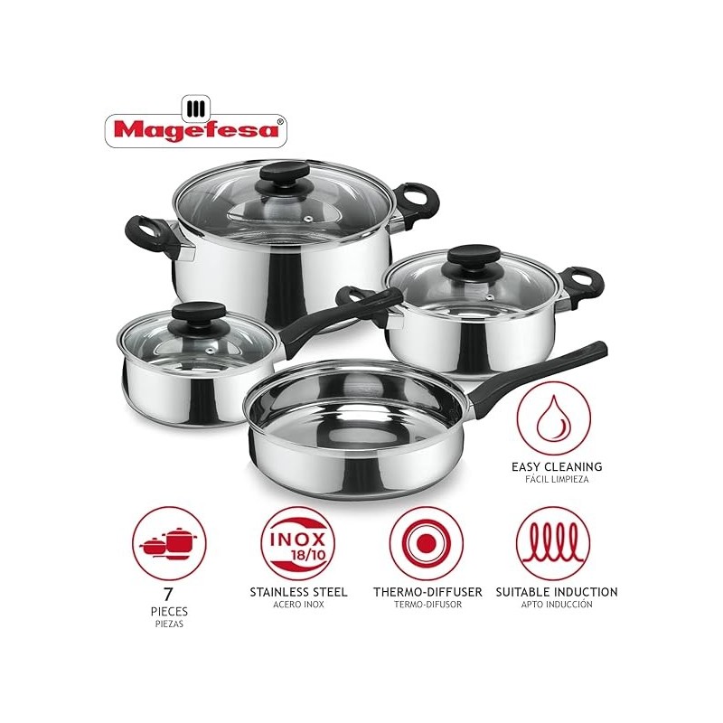 Batterie de cuisine , 7 pièces , Casserole 16cm avec couvercle, Faitout 24cm, Faitout 18cm, poele 24cm, couvercle en verre résistant à la chaleur , inox
