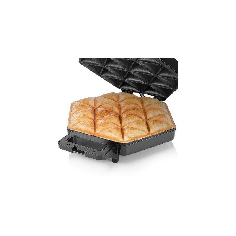 Préparez la recette traditionnelle samosa indienne avec des pommes de terre coupées en dés, des oignons, des pois, de la coriandre et de la viande hachée (de poulet). Ou optez pour des bouchées feuilletées festives remplies de pommes coupées en dés, de cannelle et de sucre. Tout ce que vous avez à faire est de placer une feuille de pâte feuilletée sur la plaque de fond et remplir les trous avec le remplissage ou votre choix. Mettez l'autre feuille de pâte feuilletée sur le dessus et fermez le Samosa Maker. Après 10 minutes, vous êtes prêt à être coupé et servi.